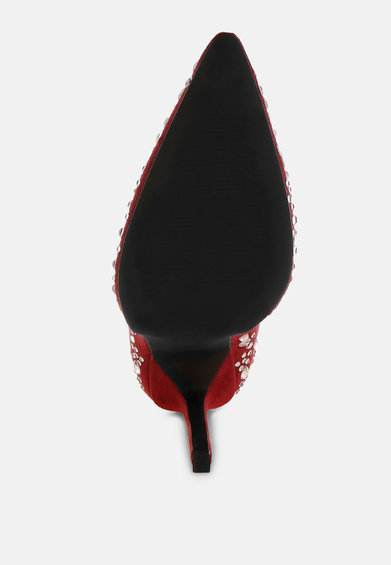These microfiber pointed toe boots will make a statement addition to your footwear rotation. The rhinestone embellishments add an element of bling while the stiletoo heel lends a showstopper look. Team these with your evening-ready ensembles to shine bright.