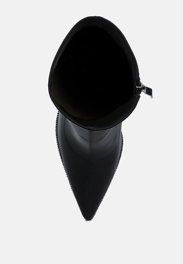The exquisite boots are comfortable and cosy with the snug fit of the stretchable lycra upper and soft cushion insoles. The subtle touch of the rhinestone embellishment around the sole and heel brings them a little bling and drama. These pointed-toed, high-heeled ankle boots are all about class!