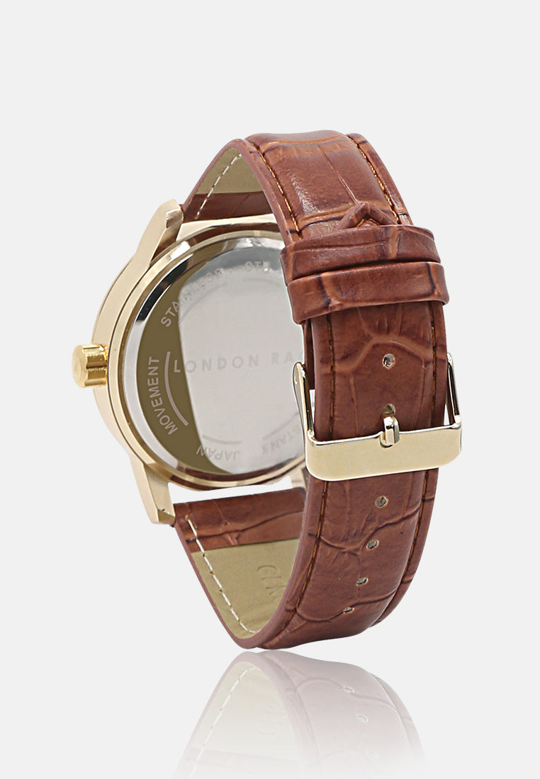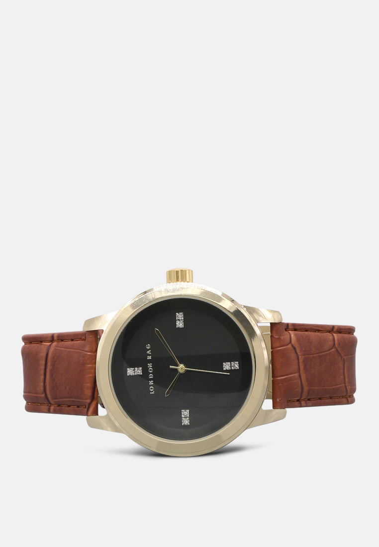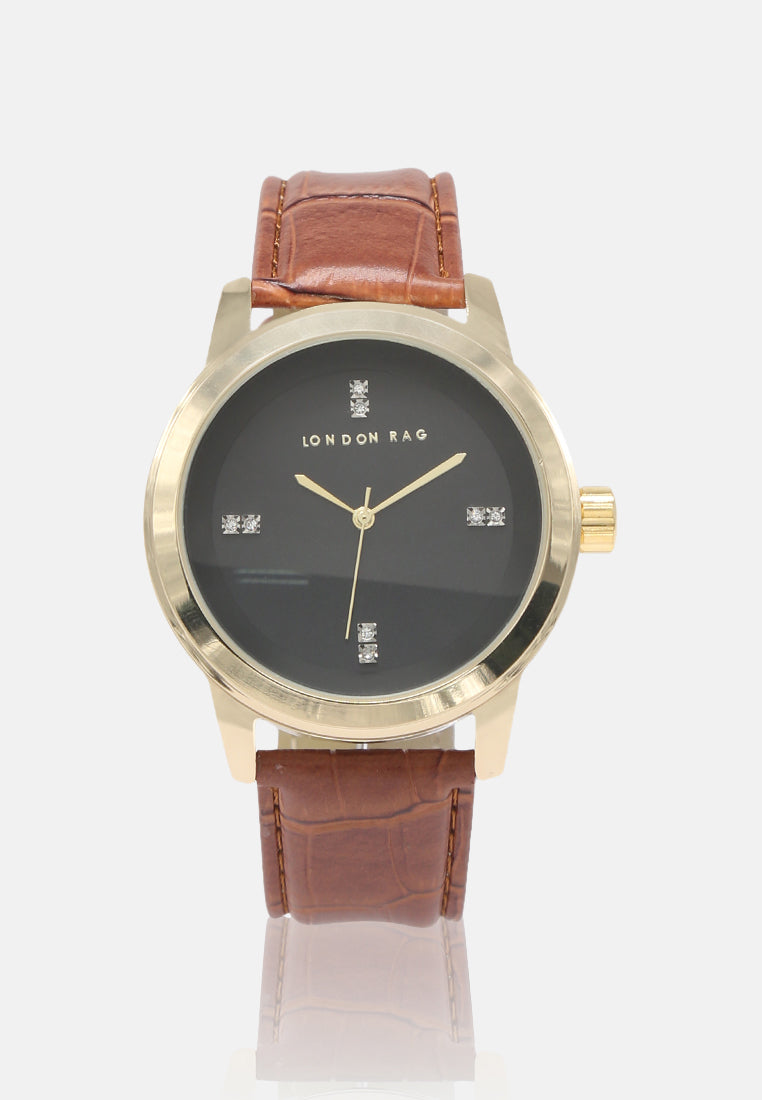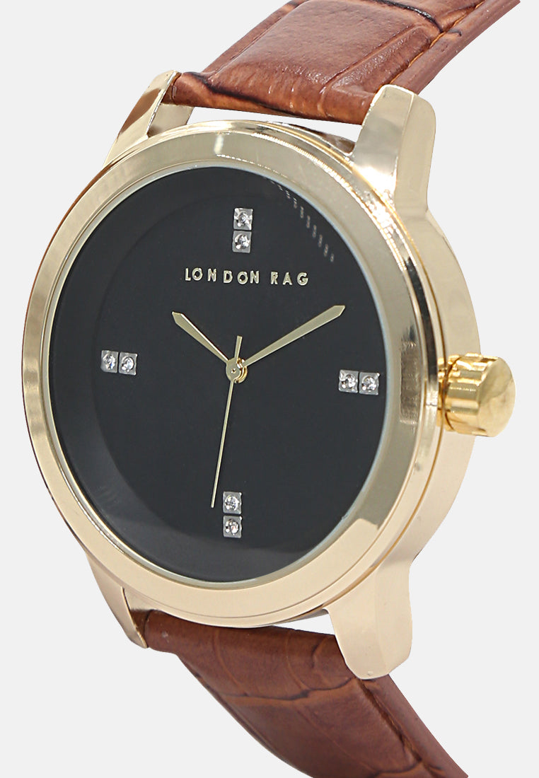 Earn admiration for your rich sense of style by wearing this analogue watch from London Rag. The timepiece displays is a stylish yet charming piece of art. The diamond studded dial is a perfect add on to your look.