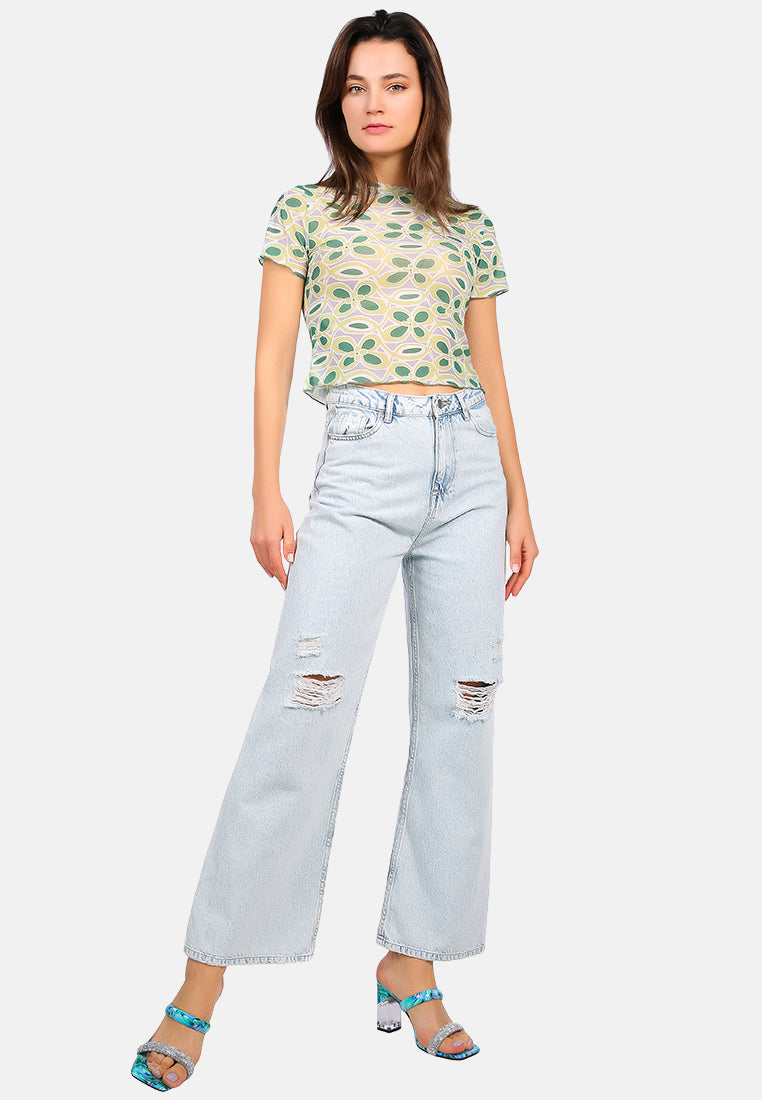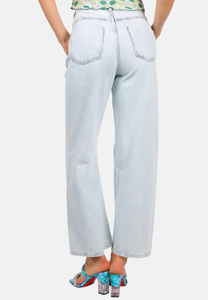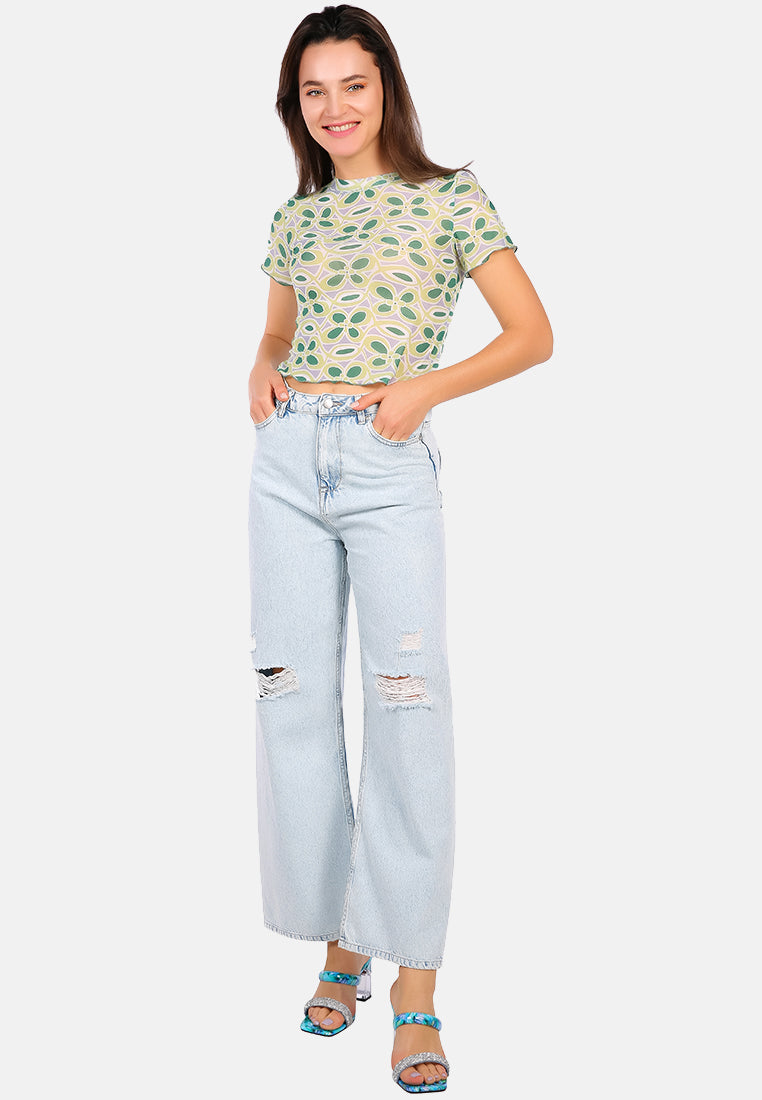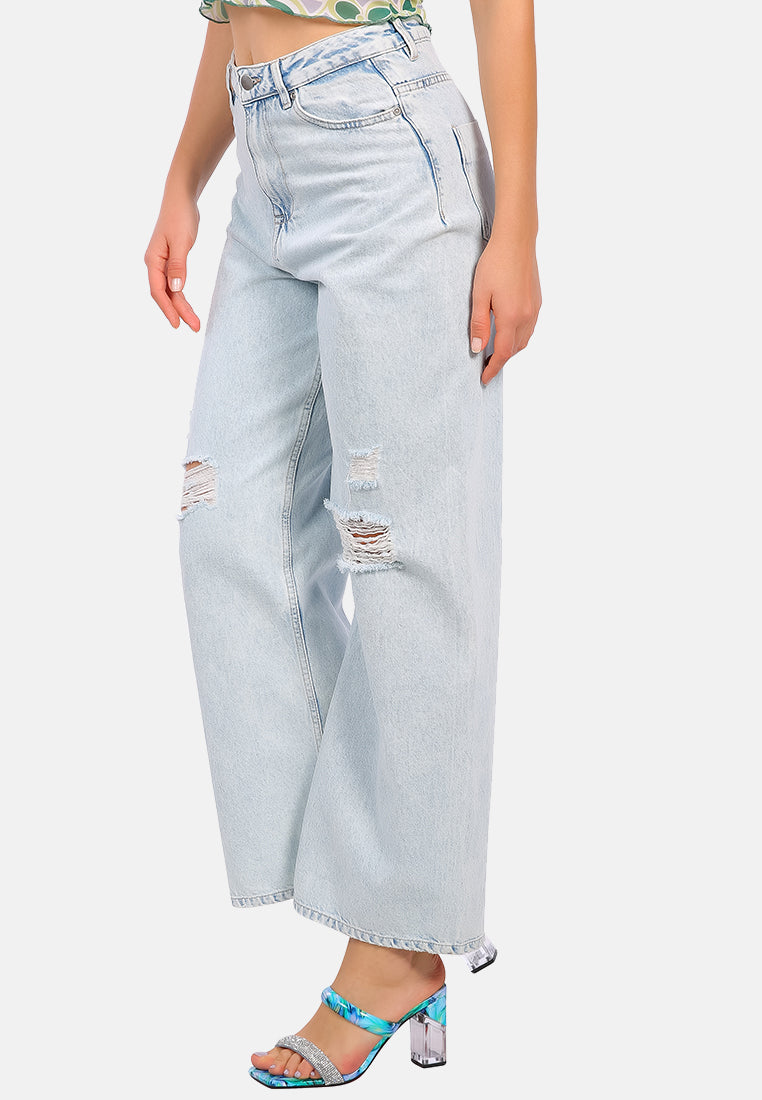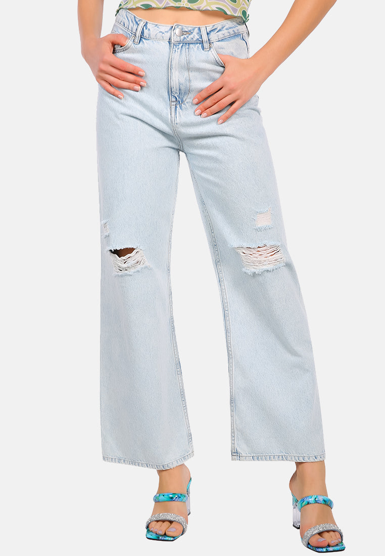 • Washed and Faded Denim Pants with a wide fit. The trendy distressed jeans has two front pockets and two back pockets – stylish ripped detail at knee. Pair it with in rage knitted ruched tops from London Rag.