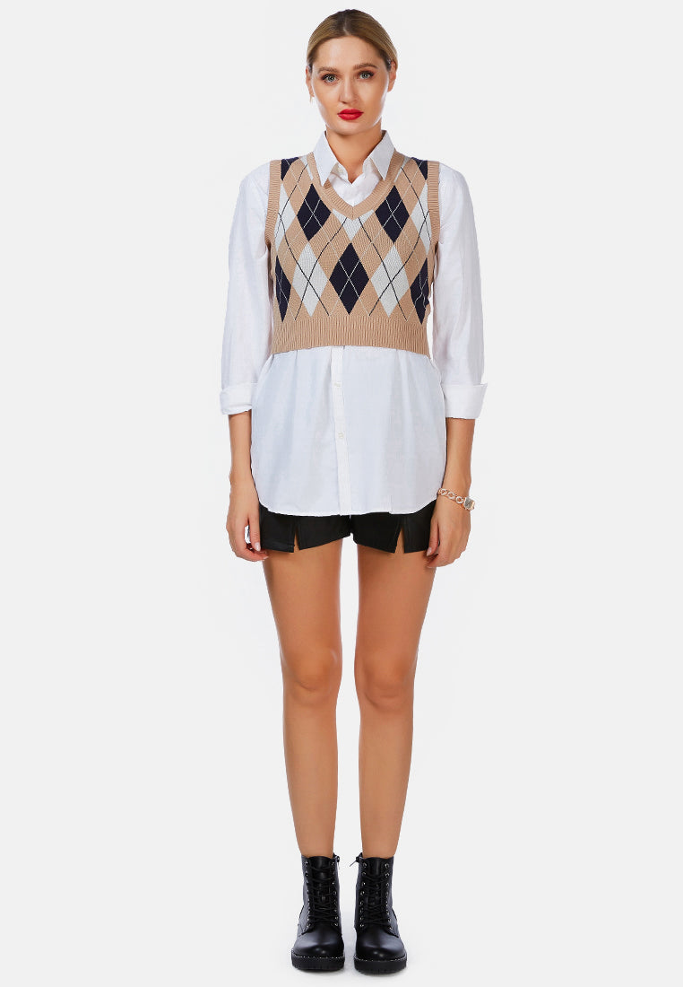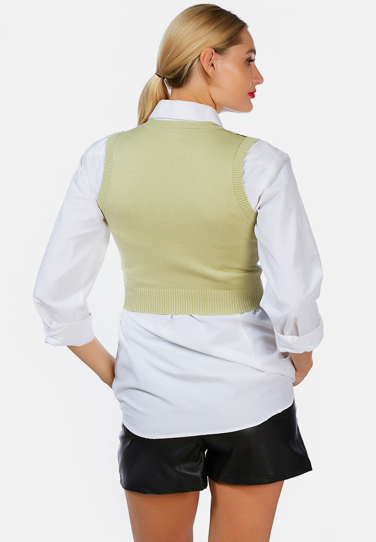 Sleeveless knitted vest in V neck with broad rib-knit armhole and hem imparts flexibility and stability to the garment. Keeps warm and cozy when the mercury drops. Comes in an array of colors to choose from.